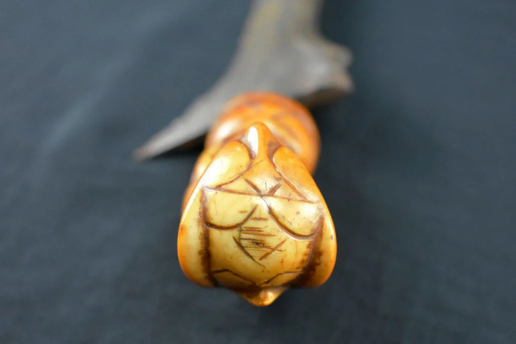 two toned, combining honey yellow scales with rich brown wood for the throat and finial. The figural